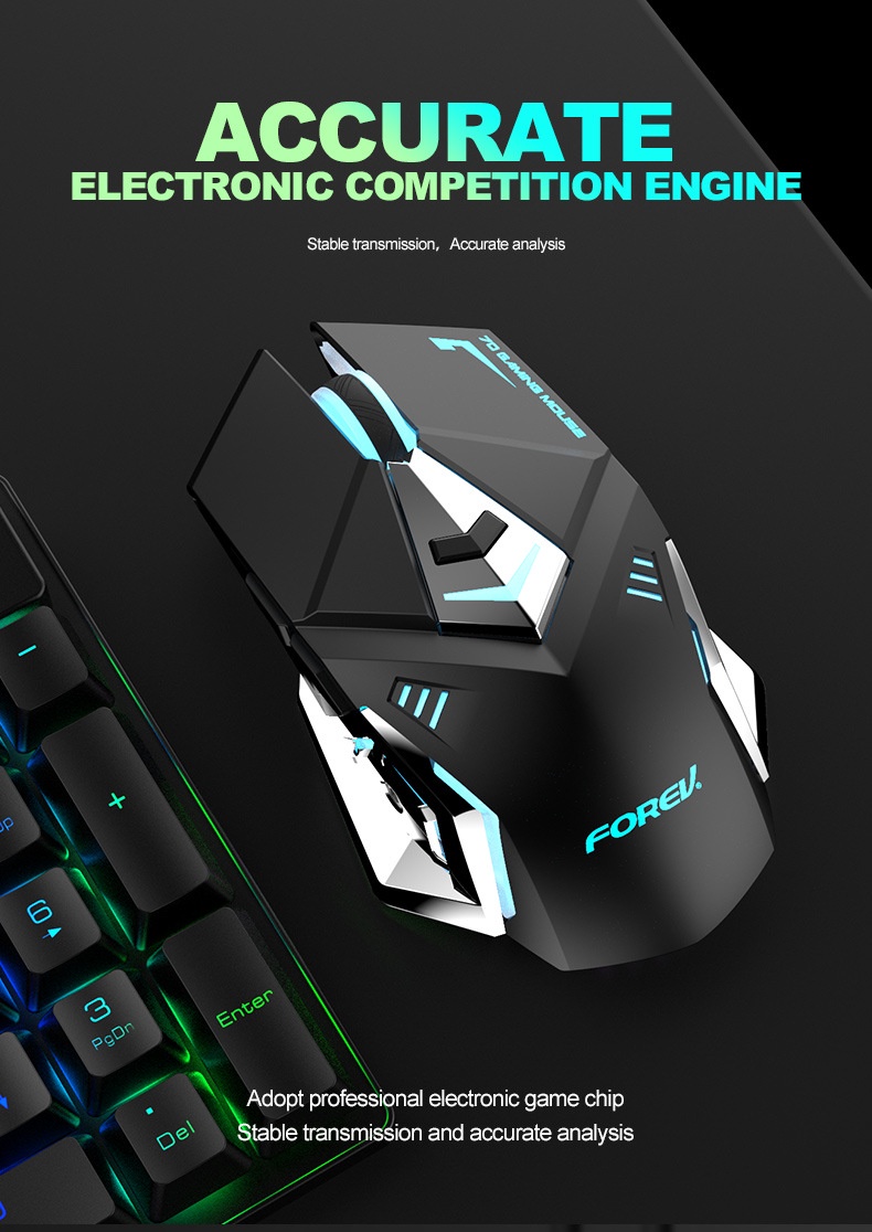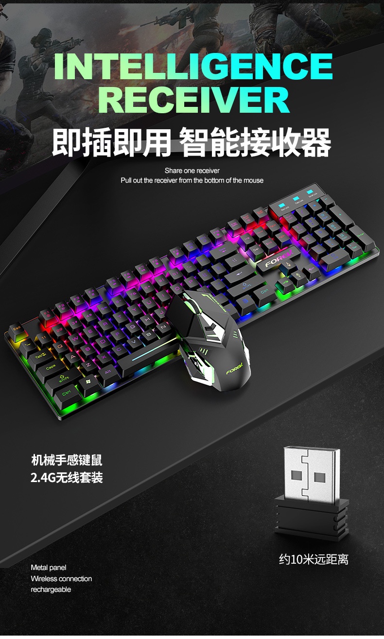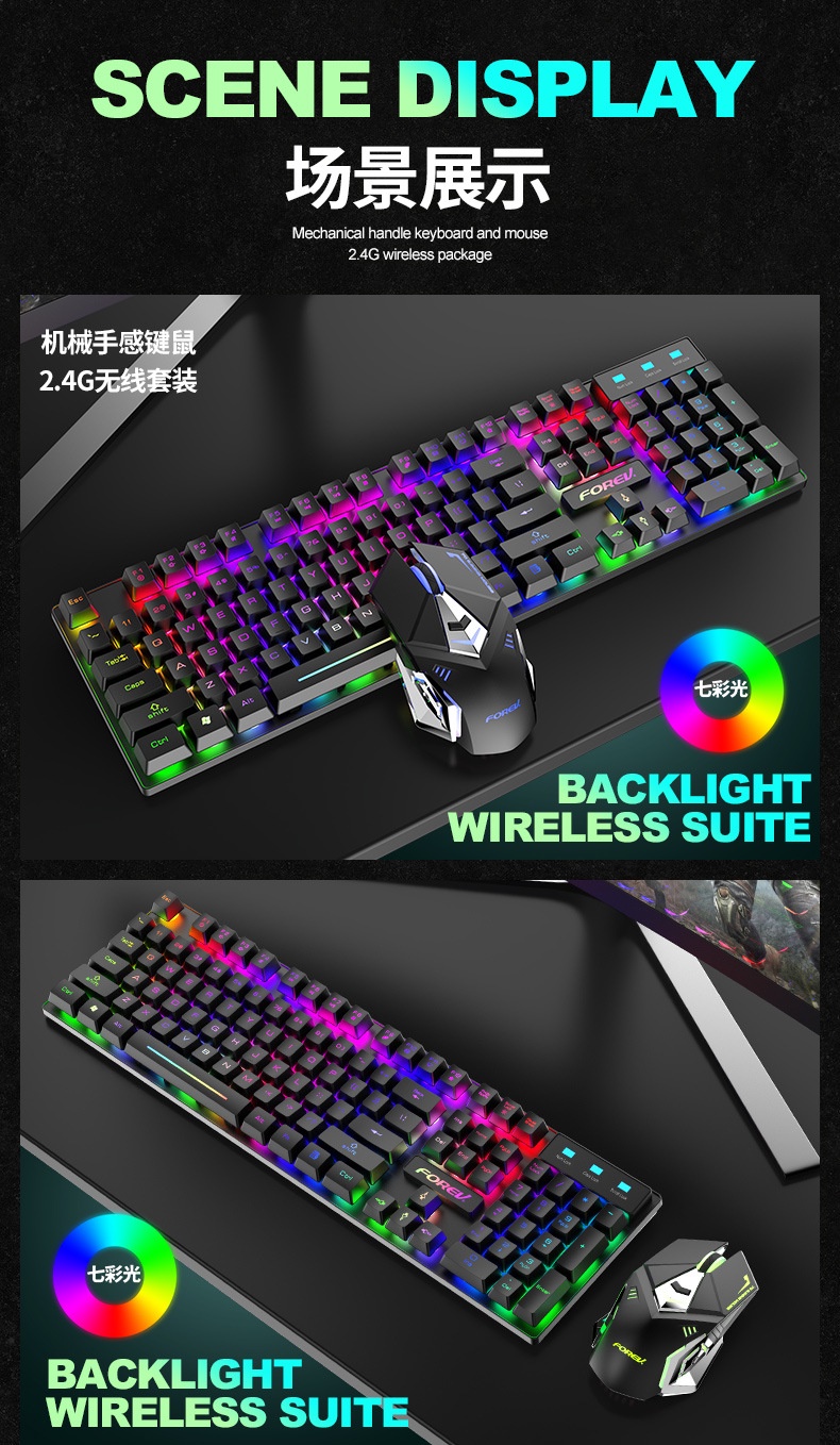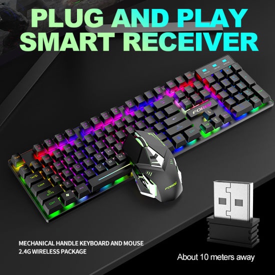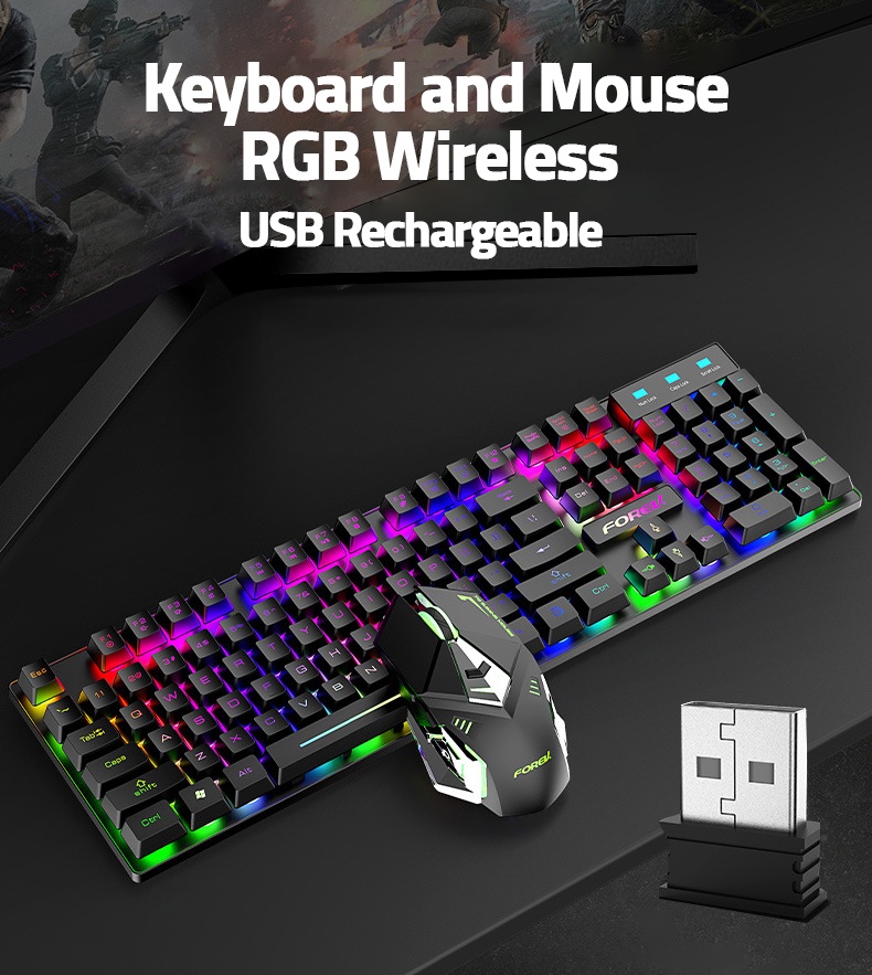 FV-380 RGB Rainbow Backlit Wireless Rechargeable Keyboard and mouse 2.4Ghz works up to 2 months from the charge